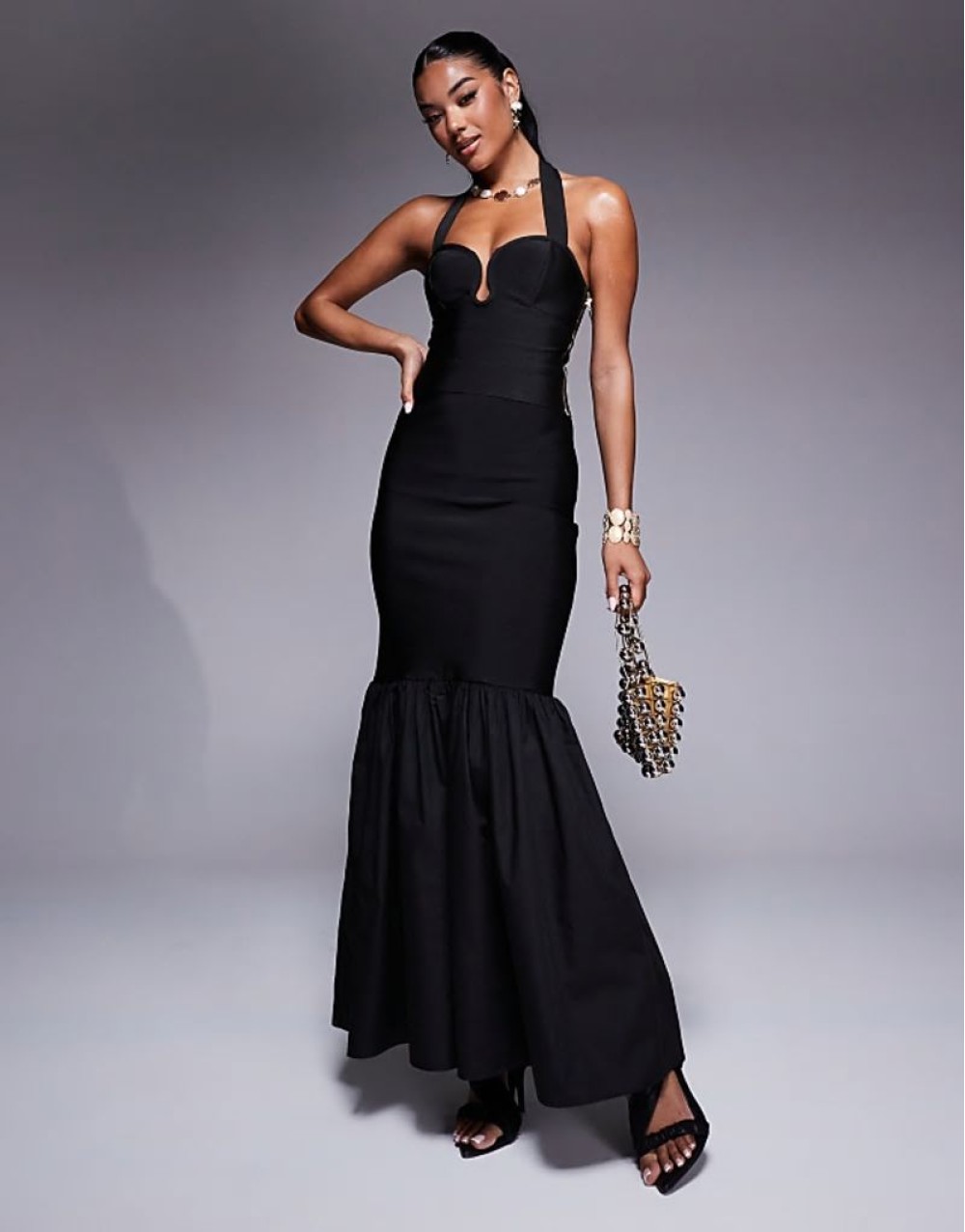 Premium co-ord bandage scoop detail halter neck top and maxi skirt in black